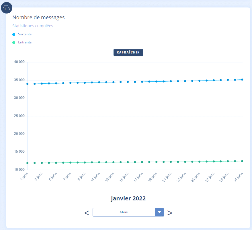 Le total cumulé est visible dès le tableau de bord sur la cartouche de votre chatbot.