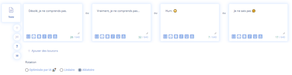 Pour améliorer les performances d’un bouton vous pouvez utiliser les fonctionnalités d’AB Testing de Botnation en mettant en concurrence plusieurs nomenclature et/ou en changeant l’ordre d’affichage. Vous pourrez ensuite comparer et optimiser vous même ou bien laisser le chatbot le faire automatiquement avec l’option “Optimisé par l’IA”. Cela fonctionne aussi avec les carrousels.
