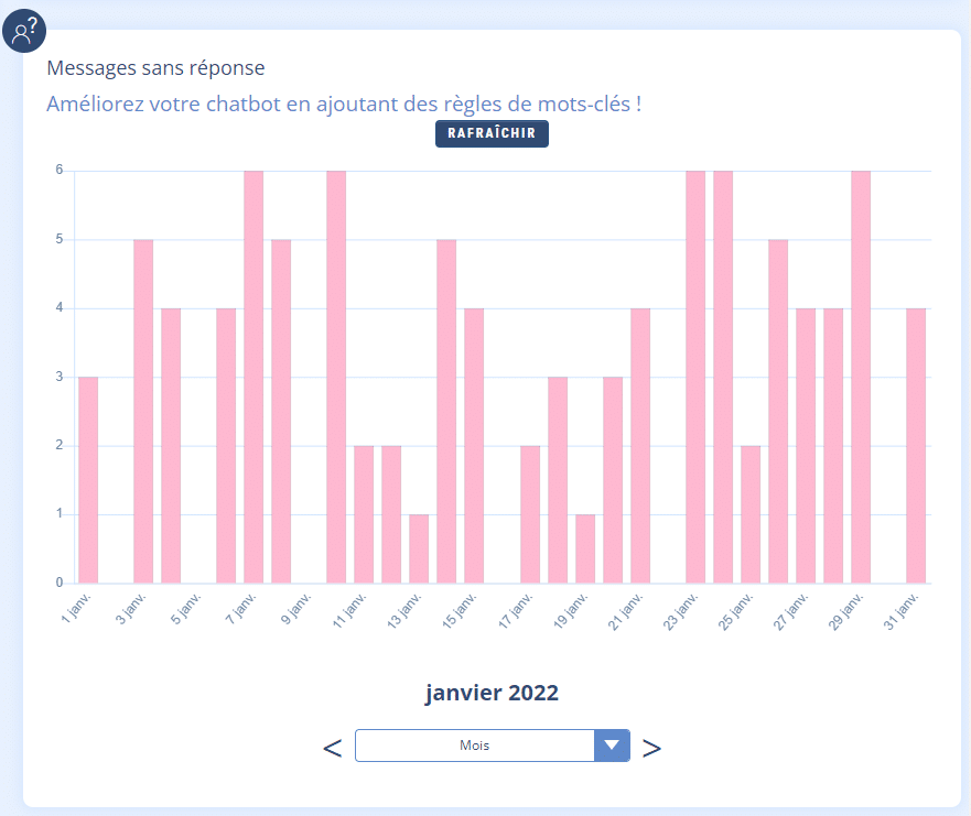 Ce graphique qu’on trouve dans l’onglet Statistiques, visualise le nombre de fois où le chatbot n’a pas su répondre à l’utilisateur. Bien évidemment, c’est une statistique qu’on cherche à avoir la plus basse possible.