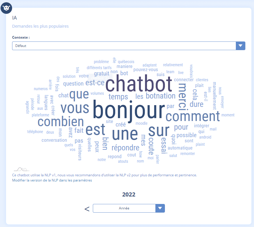 Pour connaitre les demandes les plus fréquentes faites à votre chatbot, Botnation vous propose une solution visuelle : le Nuage de mots. En passant votre souris sur un mot vous saurez combien de fois il a été utilisé dans la période de temps choisie.