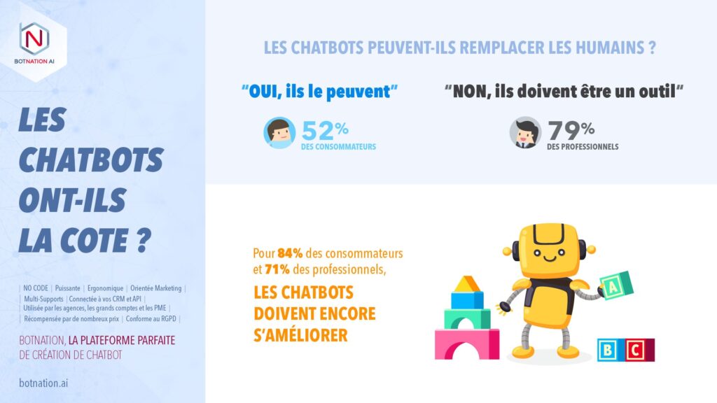 52 % des consommateurs pensent que les chatbots peuvent totalement remplacer les humains dans la relations alors que 79 % des professionnels pensent qu’ils sont davantage un complément.