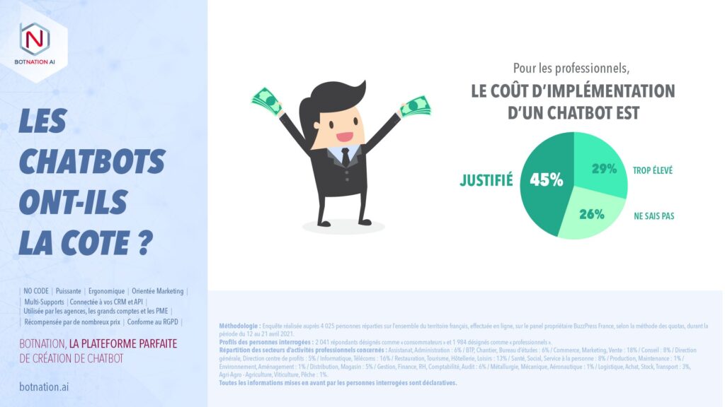 Du côté des professionnels, le coût d’implémentation d’un chatbot ne semble pas être un frein particulièrement fort puisque 45 % le considèrent comme étant justifié et 26 % ne s’expriment pas sur le sujet. Seulement 29 % le trouvent trop élevé.
